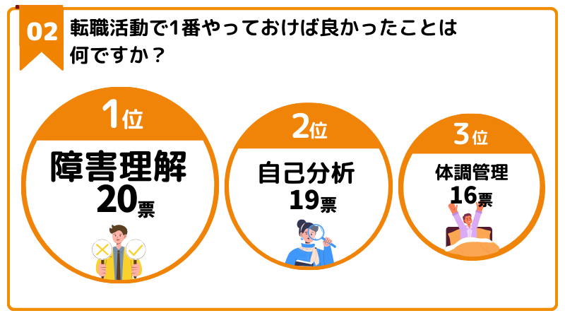 ② 「障害理解」「自己分析」「体調管理」の順に転職活動中やっておけばよかったと思う人が多かった