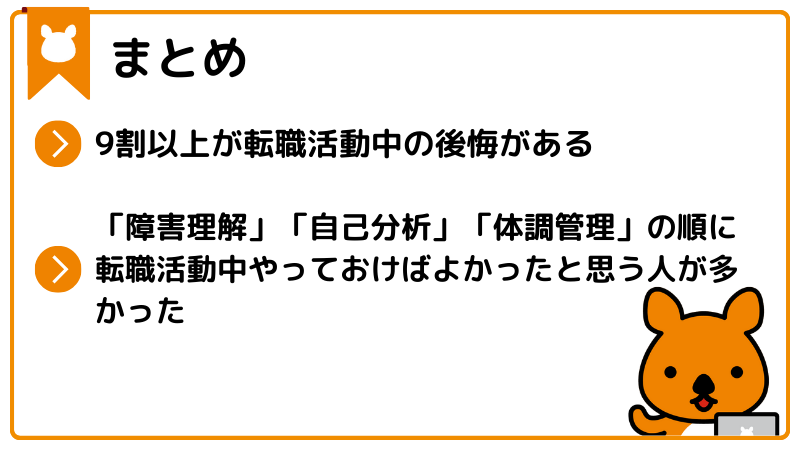 転職活動でやっておけば良かったこと第1位は「障害理解(説明の仕方、求める配慮など)」でした。