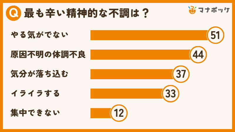 アンケートの結果、精神的な不調として最も多かったのは「やる気がでない」で、26.3%を占めました。続いて「原因不明の体調不良」が22.7%、「気分が落ち込む」が19.1%という結果になりました。