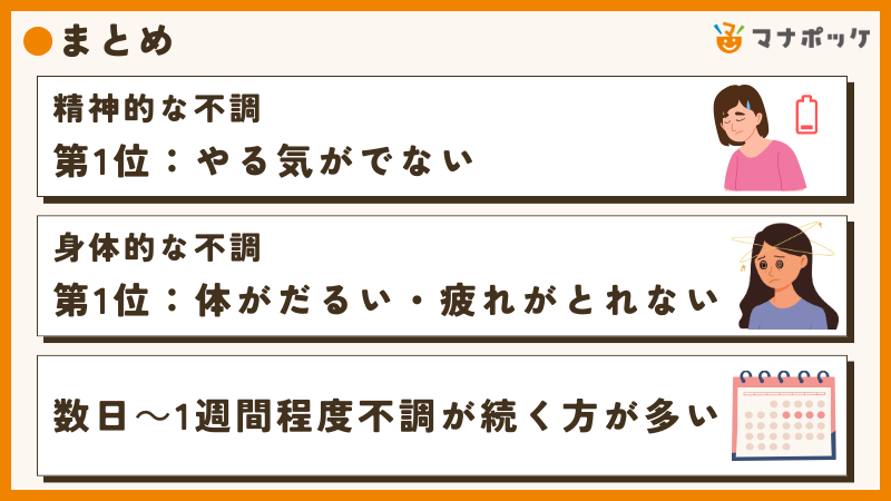 数日~1週間程度不調が続く方が多いことがわかりました。長期間続くという回答は少なかったです。