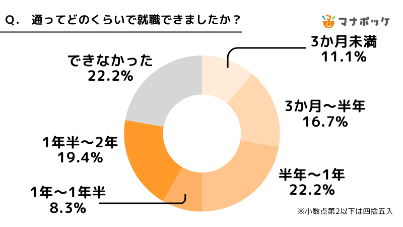 通って『半年~1年』で就職できたと答えた方が最も多い結果となりました。次に多かったのが『1年半~2年』『3か月~半年』という結果に。円グラフを見てみると約5割は1年以内に就職していることが分かります。意外と早くに就職する人が多いですね。