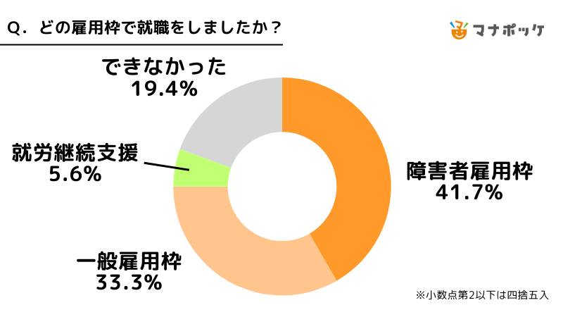 『障害者雇用枠』での就職をした人が最も多かったです。その次に多かったのは『一般雇用枠』での就職という結果でしたが、3名しか差はありませんでした。就労移行支援からの就職だからと言って、障害者雇用枠での就職がダントツで多いわけではないようです。それぞれ自分の考えで就職する雇用枠を選択していることが分かりますね。