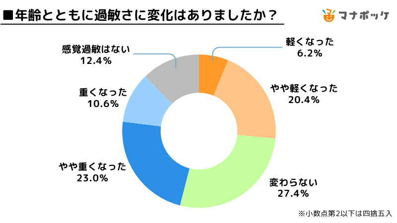 「変わらない」が27.4%、「やや重くなった」が23.0%、「やや軽くなった」が20.4%という結果に。あまり大きな差はありませんね。年齢とともに過敏さに変化があるかどうかは個人差があるようです。