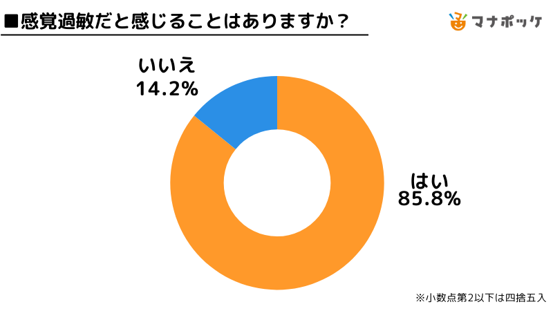 約8割の方が感覚過敏だと感じていると答えました。発達障害で感覚過敏の特性を感じながら生活している人が多いようですね。