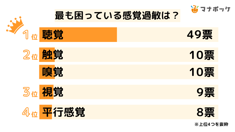 1位:聴覚(特定の音やにぎやかな場所が苦手)49票(43.4%)