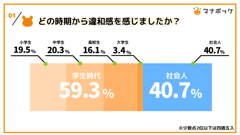 社会人になってから違和感を感じた人は40.7%で、学生時代に比べては少ないですが、社会に出てから初めて違和感を感じることはあるようです。