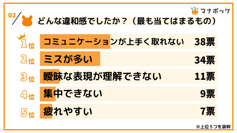 ② 感じた違和感は「コミュニケーションが上手く取れない」「ミスが多い」「曖昧な表現が理解できない」