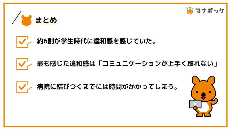 印象的だったのは、違和感に気づいてから病院に行くまでの期間が長いほど、「自分が発達障害と診断を受けるのが怖かった」というコメントが多く見受けられました。