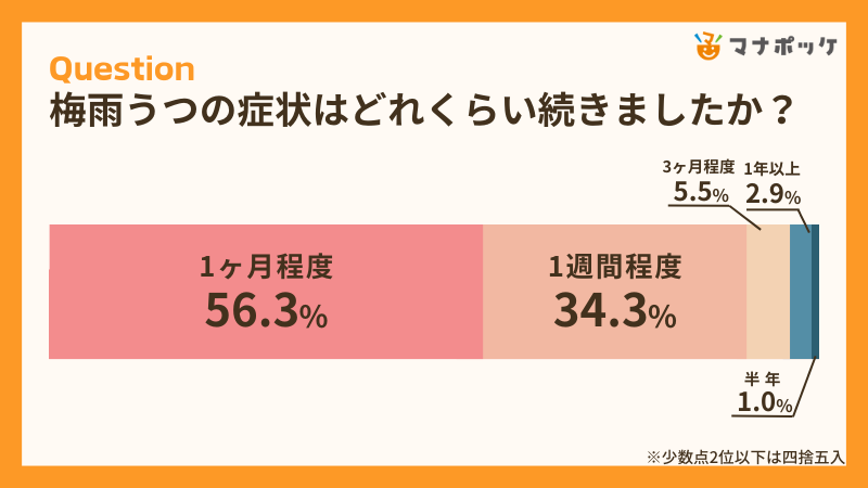 「1ヶ月程度」と答えた人は56.3%で、2人に1人は梅雨うつが1ヶ月程度続いていることが分かります。