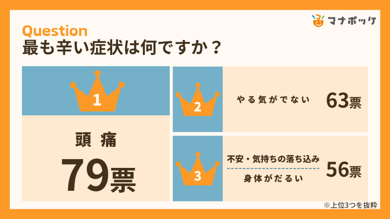 ①最もつらい症状は「頭痛」「やる気がでない」「不安・気持ちの落ち込み」「身体がだるい」