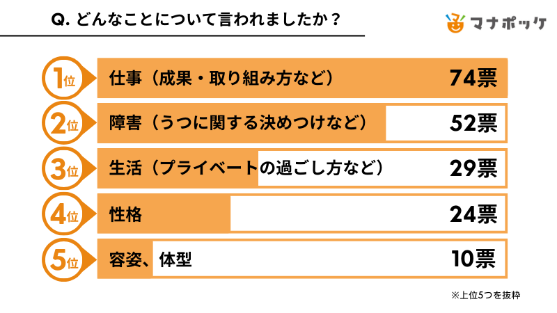 仕事に関することで嫌なことを言われたと答えた方が最も多い結果となりました。次に多かったのが「障害について」「生活について」という結果に。具体的にどんなコメントがあったか見ていきましょう。